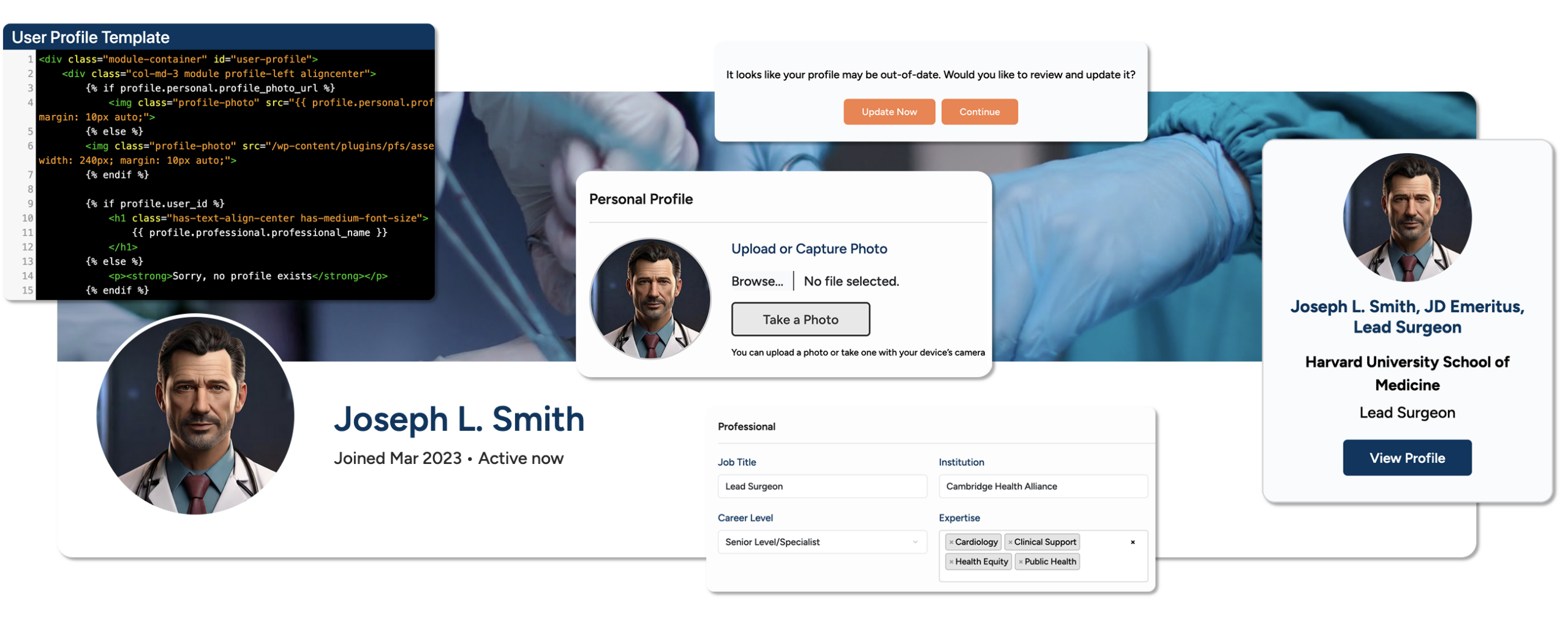 The goal of an association is to support its members on their professional journeys or in their professional endeavors, so it is key that the profile fields and selections be aligned with their objectives. Use modern webcam image capture, leverage user profile freshness alerts to request profile updates, and manage fields and selection options.
