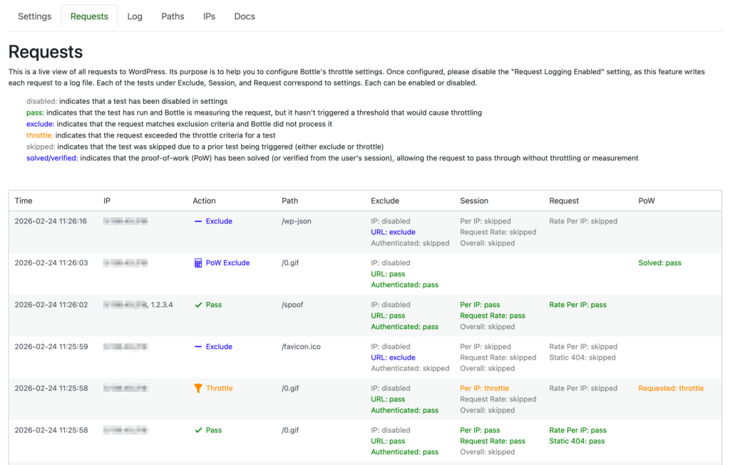 Bottle works by performing a variety of checks on each HTTP request made to WordPress, and throttling sessions or IPs when thresholds are exceeded. These include: