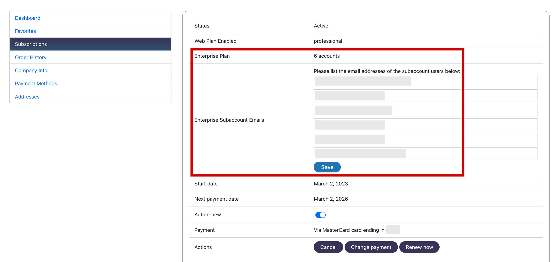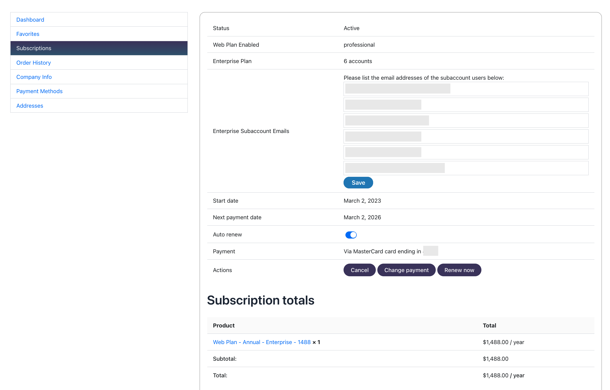 In the example below, we extended WooCommerce Subscriptions to allow our client to sell a variety of subscription products. One of the features involved subaccounts, so we also customized the my account -> subscriptions screen to allow an account holders to specify which users should have access to their paid subscription.